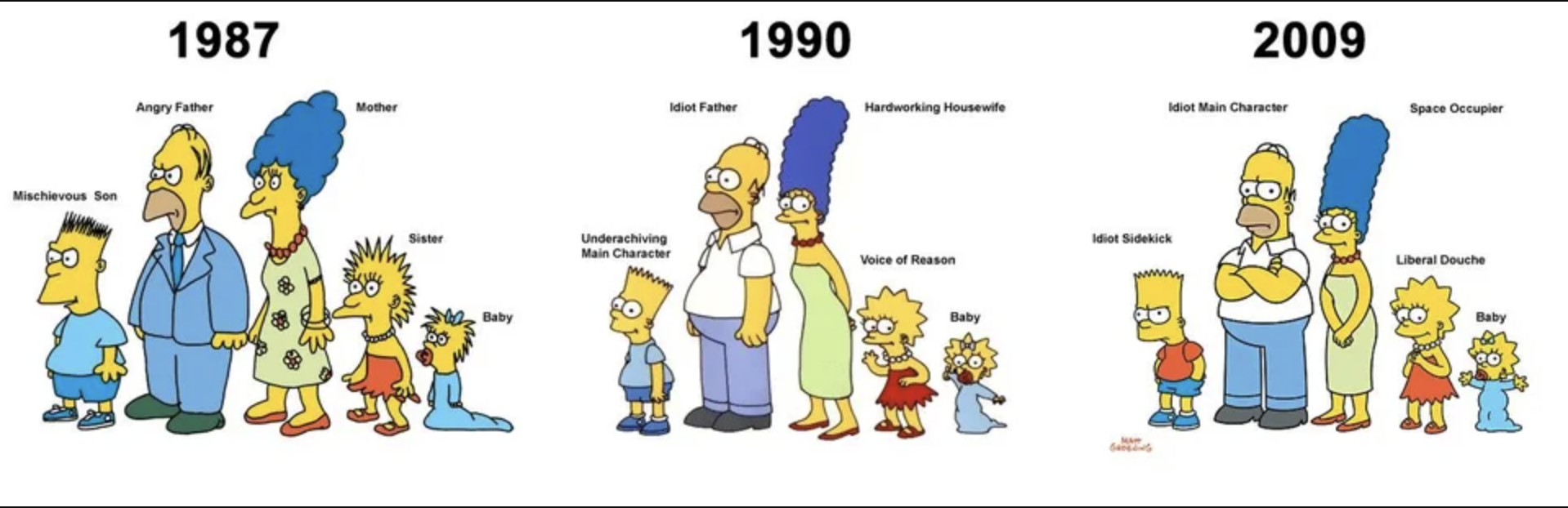 over the time the simpsons have lost quality and the humor in their jokes, the old simpsons episodes were also mostly relatable because the writers covered real life topics, like homer going into a deep depression after he was fired the very first time, meanwhile the more modern episods have homer get fired from his job every other episode for him to be rehired, even homer doesn't care anymore because he knows he is just going to get rehired at the end of that episode.