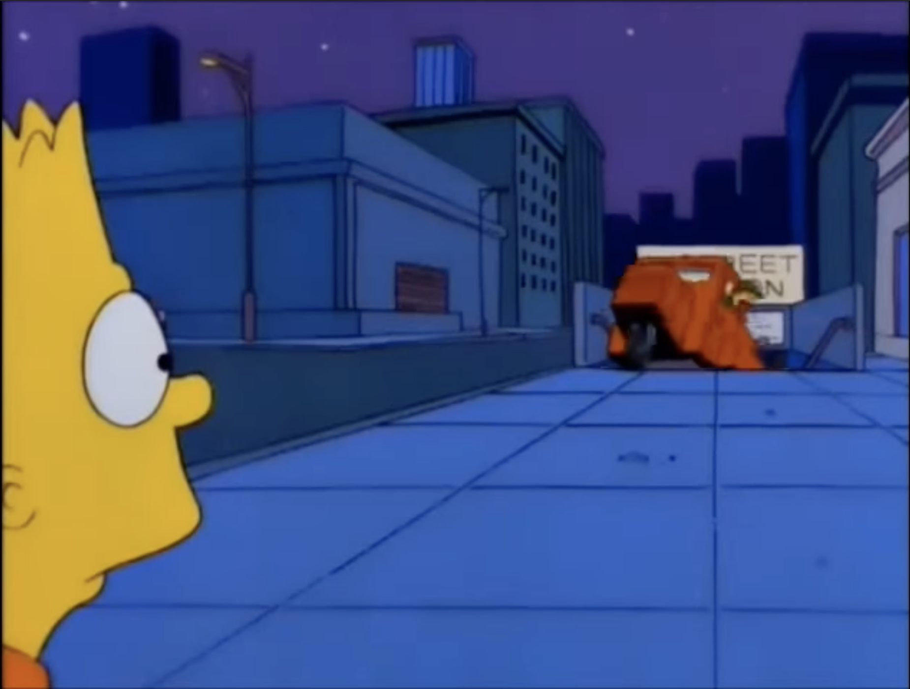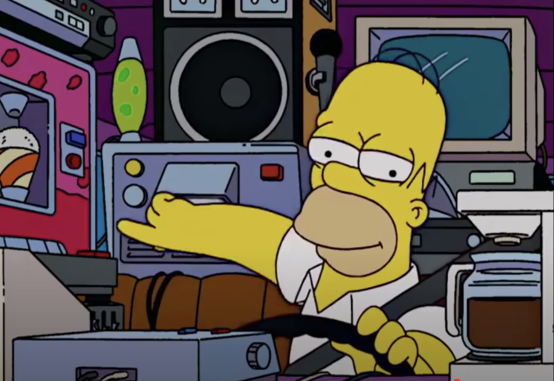 Now compare that with a modern Simpsons joke, Homer buys a lot of junk for his car and then activates a fog machine.